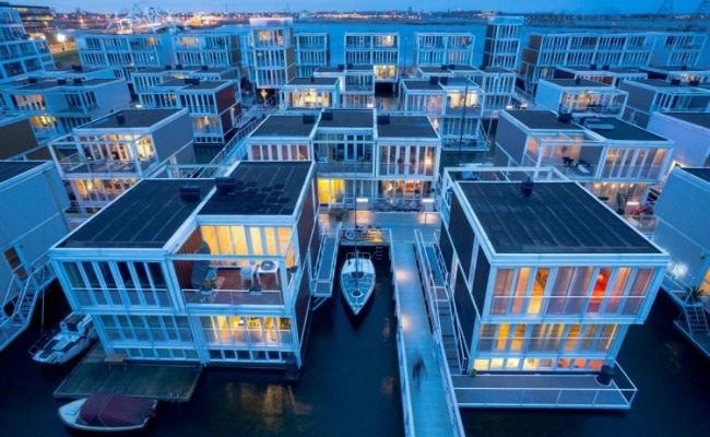 Waterbuurt — Dutch for “water quarter — is a state-of-the-art residential development in Amsterdam, which consists of nearly 100 individual floating homes moored on Lake Eimer. The floating homes are no ordinary houseboats, but real floating houses. They float adjacent to jetties and are moored to steel pylons, so they only move vertically with the changing tides. The floating homes are built atop submerged concrete platforms and consist of a light steel frame, wooden walls and paneling. The bedrooms and bathroom are located on the lower floor, which is partially flooded. The kitchen and dining room are located on the raised ground floor, while the main living area and the outdoor terrace are on the top level. Designed by Dutch architect Marlies Rohmer, the houses have a no-nonsense, basic design, but are comfortable at the same time. They were built at a shipyard about 40 miles north of Lake Eimer and transported through a network of canals. Two-thirds of the Netherlands’ population lives below sea-level, and with the melting ice cap becoming a serious concern, there are many who believe that living on water is much safer than living on land, especially since the prices of land homes in large urban centers like Amsterdam have sky-rocketed in recent years.