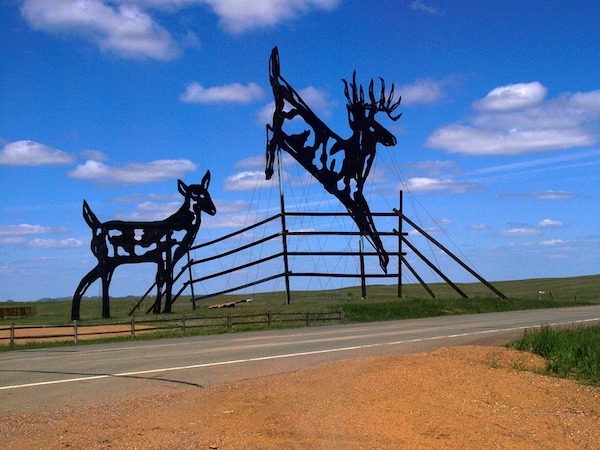 | “Deer Crossing” was constructed out of used oil well tanks and erected in 2002. The jumping buck is 75 feet tall and 60 feet long. The doe is 50 feet long and 50 feet tall. |