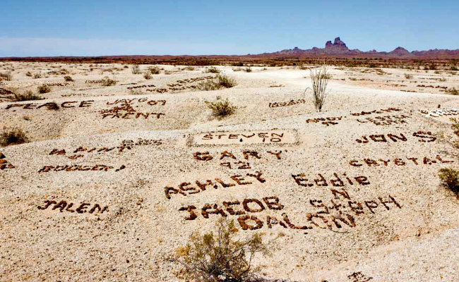 For over 70 years, people have been driving out in their RVs to a remote desert near the city of Yuma in Arizona to write their names and leave messages on the desert floor. Unlike regular graffiti that’s harmful to the environment, the messages in Valley of the Names are spelled out by carefully arranging rocks and small boulders in the hard-packed white sand. The practice began during World War II, when General George Patton took his soldiers to the flat, rocky area to train. The training camp — known as the Desert Training Center — was the largest military training ground in the history of military maneuvers. The grounds of the camp stretched from the outskirts of Pomona, Calif., to within 50 miles of Phoenix and to the southern tip of Nevada. The earliest messages were made by the soldiers, and the area was rediscovered by off-roaders in the 1960s. By the 1970s, what used to be a 4-acre area with a few hundred names swelled to thousands of names spread over 1,200 acres of the desert floor. Every few years, a team of volunteers goes out to clear away debris strewn by the desert winds and replace rocks that might have washed away storms. The messages are considered invaluable, with some of them being over 50 years old. Because the rocks that were there were used up, a long time ago visitors today have to haul their own rocks in to create their messages.